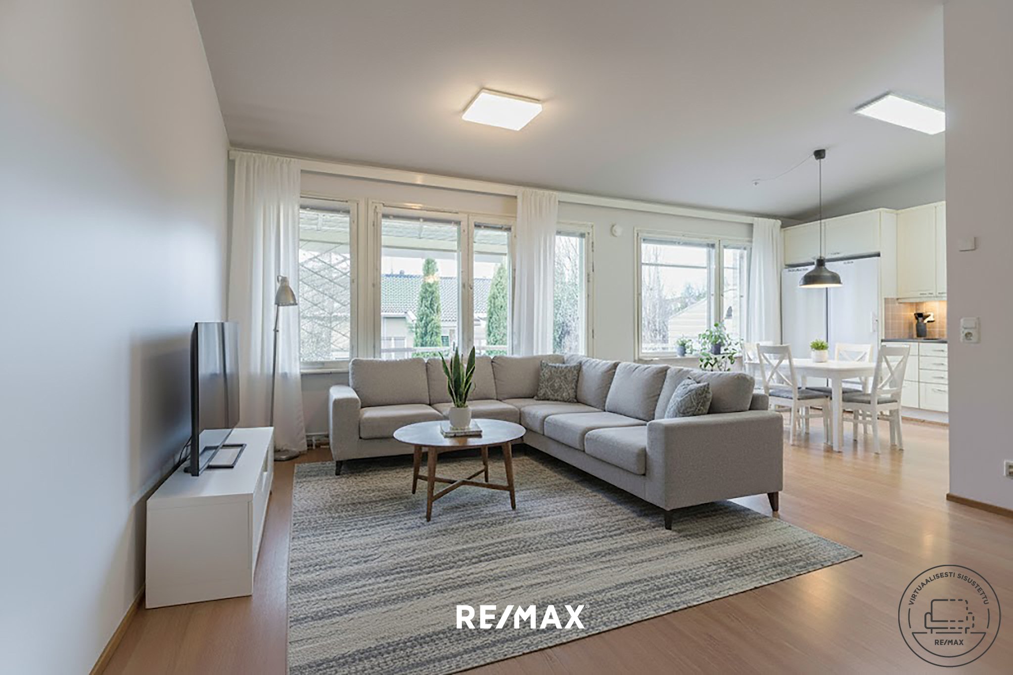 Asunnon avokeittiö ja olohuone muodostavat yhtenäisen ja avaran tilan, jossa on miellyttävä viettää aikaa perheen ja ystävien kanssa. Keittiö on hyvin varusteltu ja olohuoneesta on käynti osittain katetulle terassille, joka tuo lisätilaa oleskeluun. Kaksi makuuhuonetta tarjoavat runsaasti säilytystilaa, toisessa on kaapistot ja toisessa tilava vaatehuone.