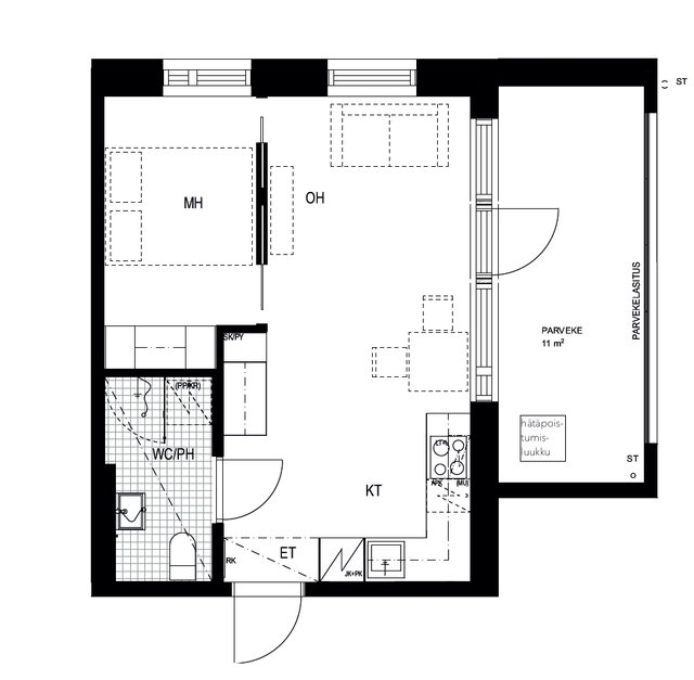 Asunnossa on avara oleskelutila ja käytännöllinen keittiö, jotka muodostavat viihtyisän kokonaisuuden arjen keskelle. Makuuhuone on tilava ja rauhallinen, ja suuri parveke toimii luonnollisena jatkeena asuintiloille – täydellinen paikka nauttia aamukahvit tai ilta-auringosta.