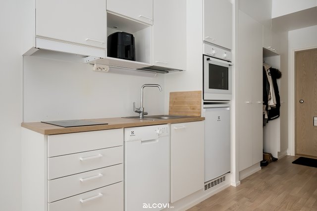 - Avokeittiön varustukseen kuuluu kalusteuuni, astianpesukone, induktioliesitaso ja jääkaappi pakastinlokerolla. Seinät on maalatut, lattia parkettia.