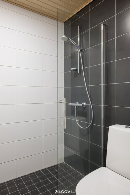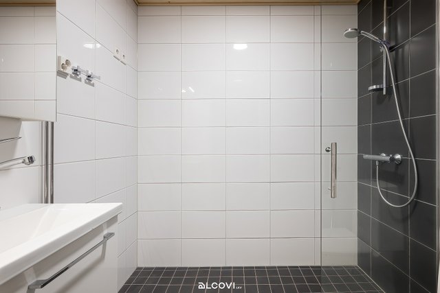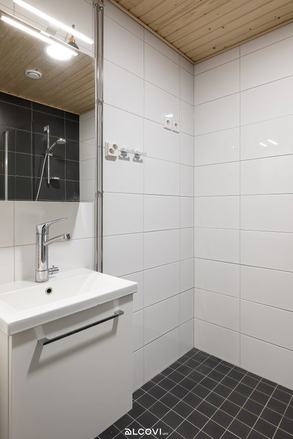 - Kylpyhuoneen varustukseen kuuluu allas-ja peilikaappi, suihku, lasinen suihkuseinä, pyykinpesukoneliitäntä, wc-istuin, bidee-suihku ja lattialämmitys (vesikiertoinen). Lattia on laattaa, seinät kaakelia ja katto paneloitu.