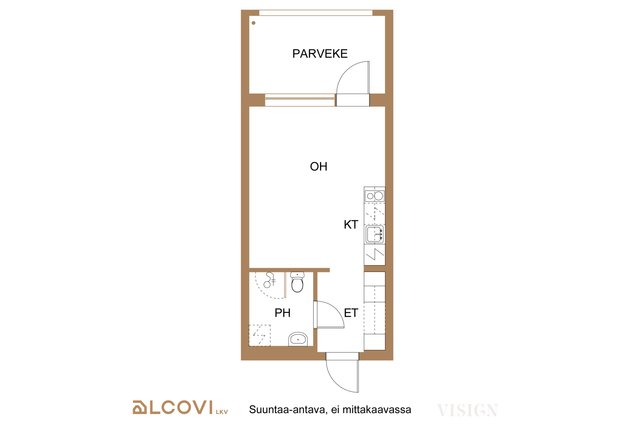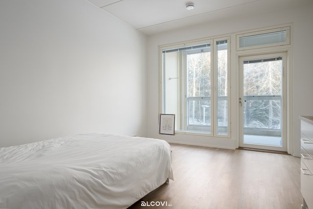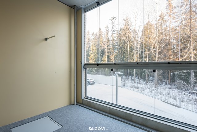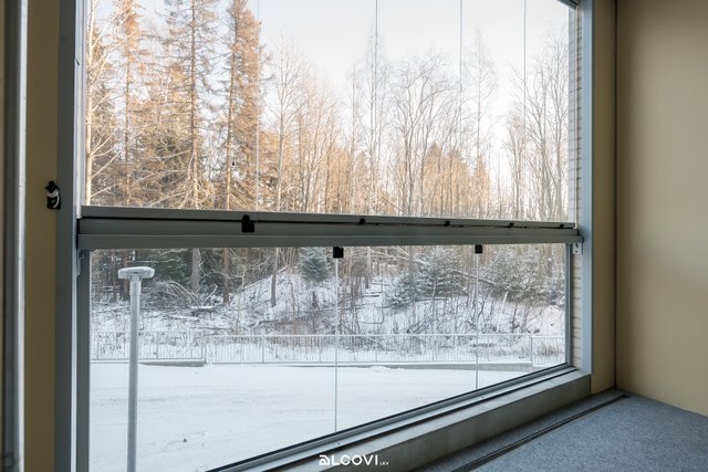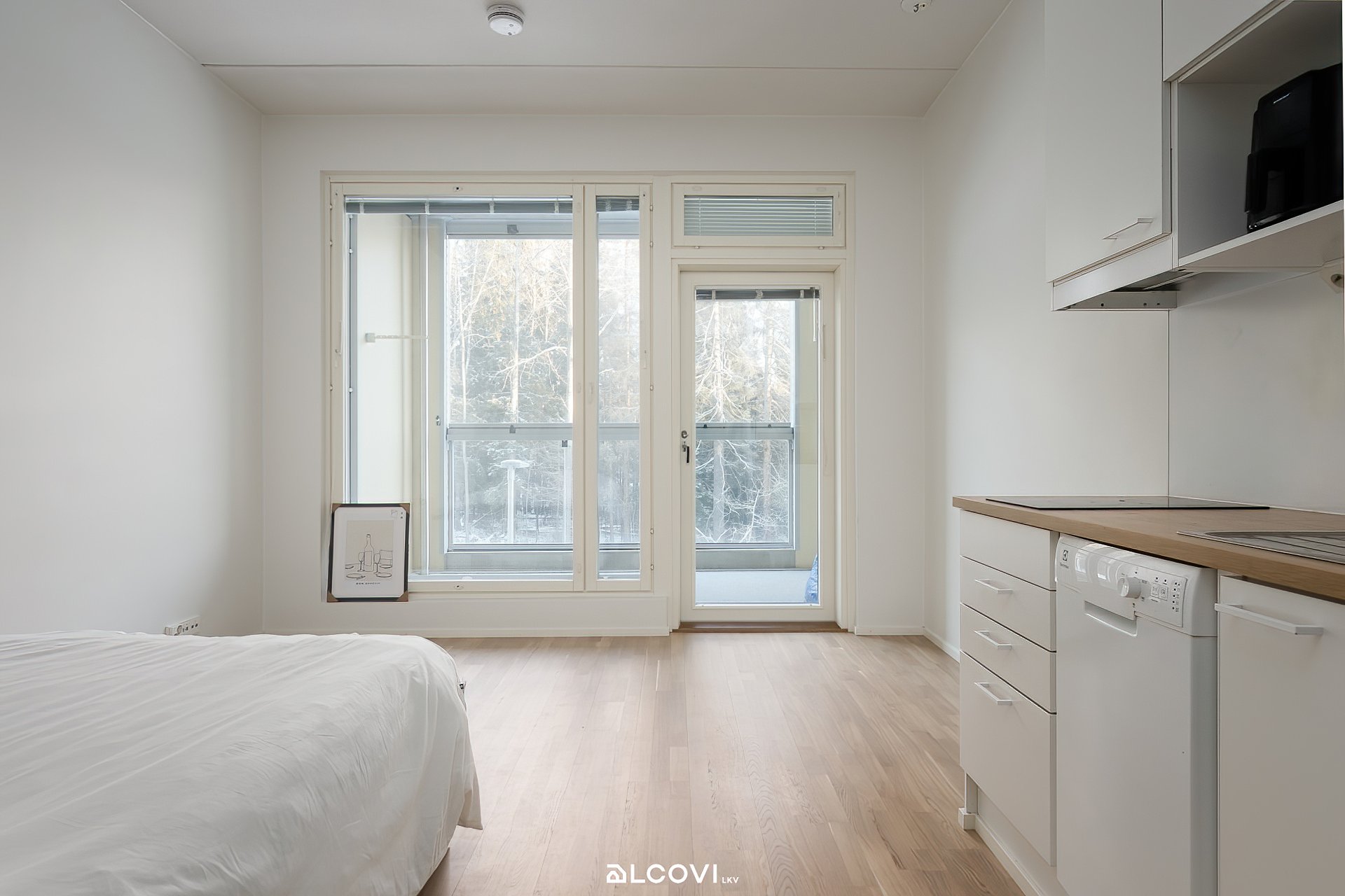 Avokeittiöstä löytyy kaikki tarvittavat toiminnot sujuvaan ruoanlaittoon. Asuinhuoneeseen sijoittaa vaivatta niin sängyn kuin sohvakalusteenkin. Asumisviihtyvyyden kruunaa reilun kokoinen lasitettu parveke, joka tarjoilee viihtyisät metsänäkymät. Ajattomin sävyin viimeistelty kylpyhuone on tilava ja siellä on paikkansa myös pyykkihuoltoon. Eteisestä löytyy mukavasti säilytystilaa, lisäksi huoneiston käyttöön kuuluu erillinen lämmin varasto.