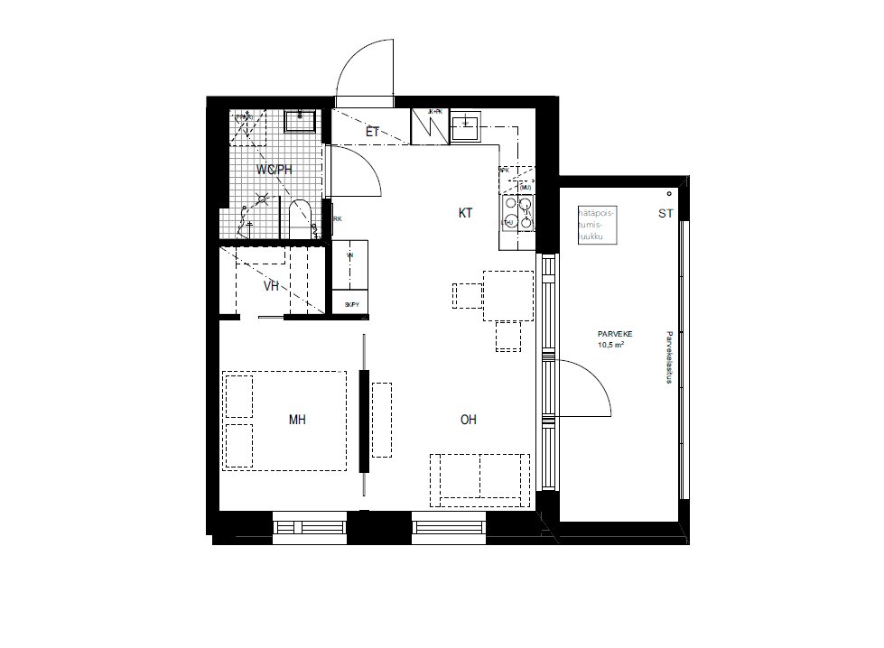 Moderni keittiö on hyvin varusteltu integroiduilla kodinkoneilla, keraamisella liedellä sekä runsaalla säilytystilalla - ruoanlaitto sujuu vaivattomasti. Olohuone ja makuutila muodostavat toimivan kokonaisuuden, joka sopii erinomaisesti niin yhdelle asukkaalle kuin pariskunnalle.
