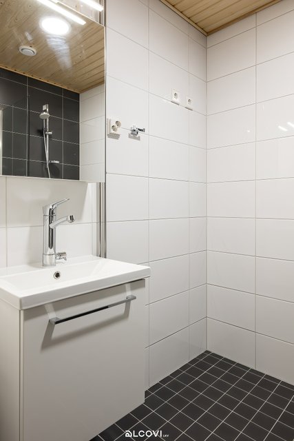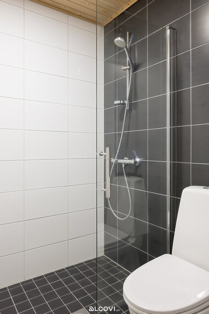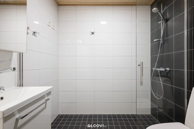 - Kylpyhuoneen varustukseen kuuluu allas-ja peilikaappi, suihku, lasinen suihkuseinä, pyykinpesukoneliitäntä, wc-istuin, bidee-suihku ja lattialämmitys (vesikiertoinen). Lattia on laattaa, seinät kaakelia ja katto paneloitu.