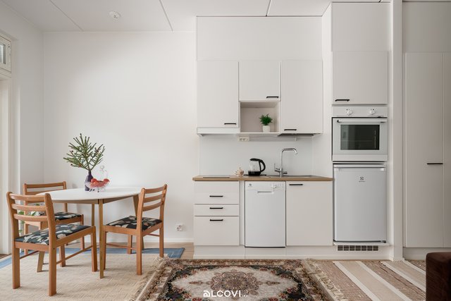 - Avokeittiön varustukseen kuuluu kalusteuuni, astianpesukone, induktioliesitaso ja jääkaappi pakastinlokerolla. Seinät on maalatut, lattia parkettia.