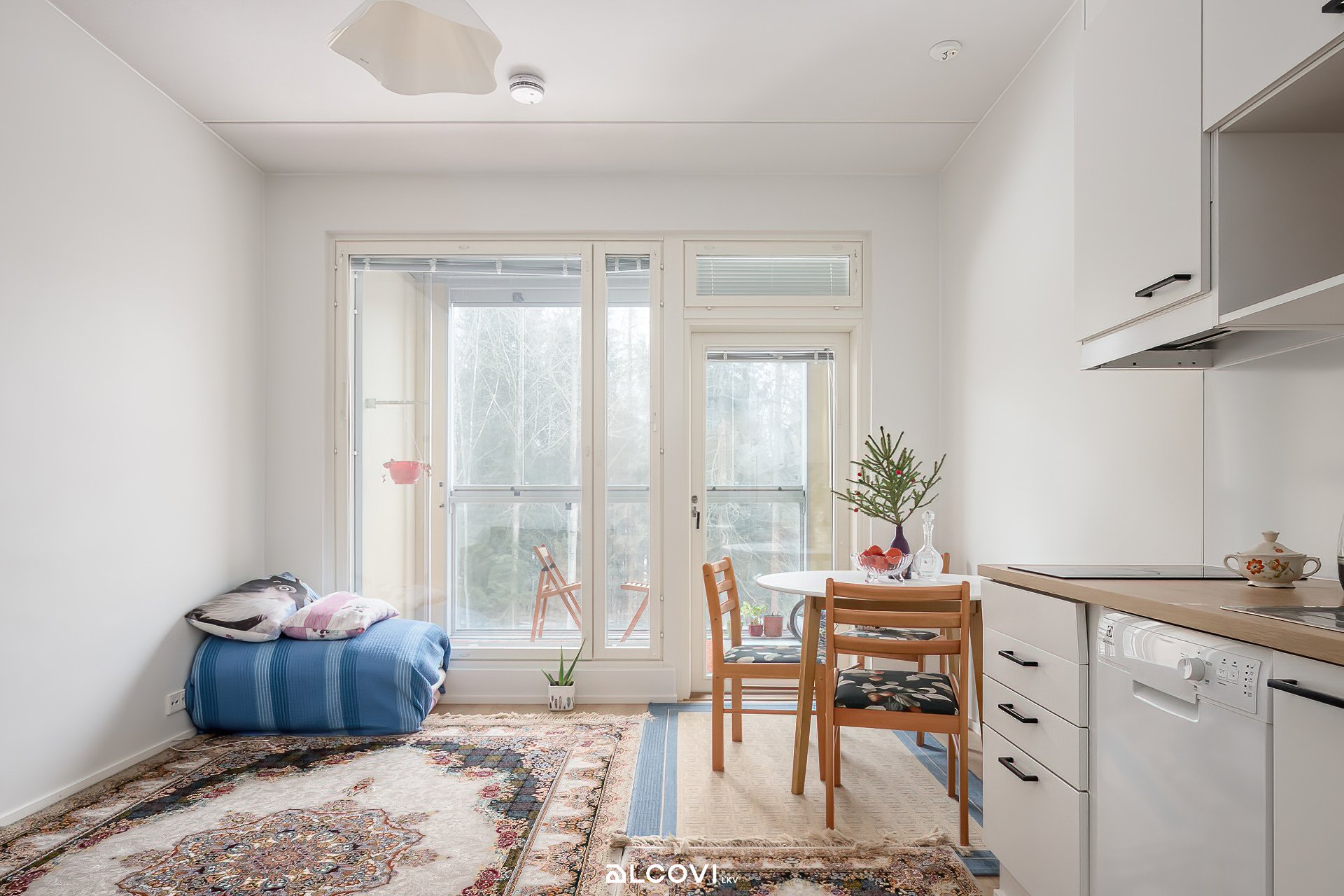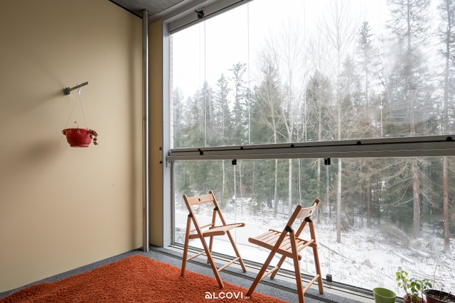 Avokeittiöstä löytyy kaikki tarvittavat toiminnot sujuvaan ruoanlaittoon. Asuinhuoneeseen sijoittaa vaivatta niin sängyn kuin sohvakalusteenkin. Asumisviihtyvyyden kruunaa reilun kokoinen lasitettu parveke, joka tarjoilee viihtyisät metsänäkymät. Ajattomin sävyin viimeistelty kylpyhuone on tilava ja siellä on paikkansa myös pyykkihuoltoon. Eteisestä löytyy mukavasti säilytystilaa, lisäksi huoneiston käyttöön kuuluu erillinen lämmin varasto.