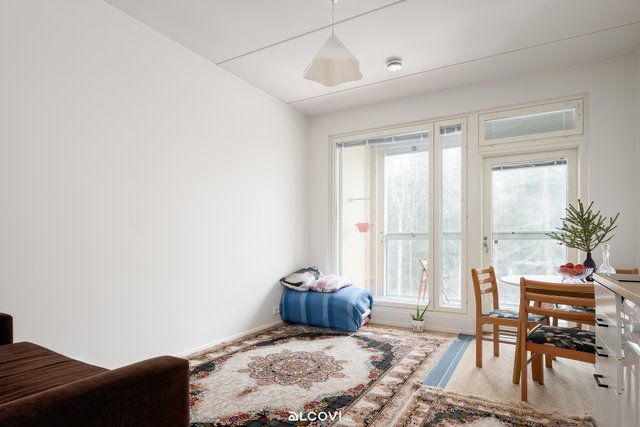 - Olo-/asuinhuoneen lattia on parkettia, seinät maalatut. Korkea huonekorkeus, kulku lasitetulle parvekkeelle.