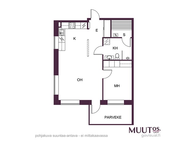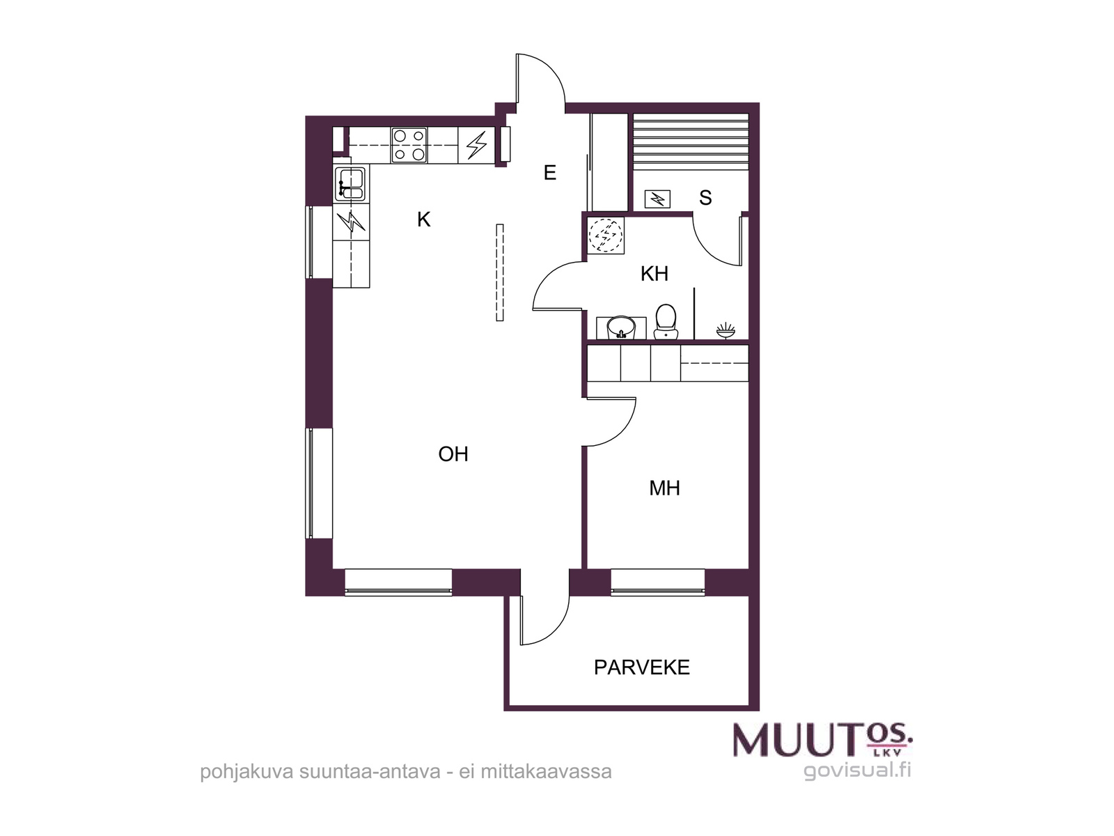 - Varustus: induktioliesi, erillisuuni, jääkaappi/pakastin, liesituuletin, mikroaaltouuni, astianpesukone, kiinteät valaisimet.