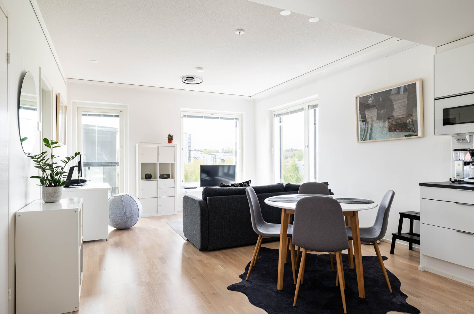 Tämän kodin ehdoton helmi on suurista ikkunoista ja lasitetulta etelä-parvekkeelta avautuva avara näkymä. Kulmasijoittelun ansiosta koti on erityisen valoisa, ja näkymät kahteen suuntaan henkeä salpaavan upeat! Tilat ovat toimivat ja tilavat, pinnat ja yleisilme kauniit ja varustus tasokas. Huoneistokohtainen ilmanvaihto kruunaa niin asumismukavuuden kuin -terveydenkin, ja oma sauna mahdollistaa rentoutumisen arjen keskellä.