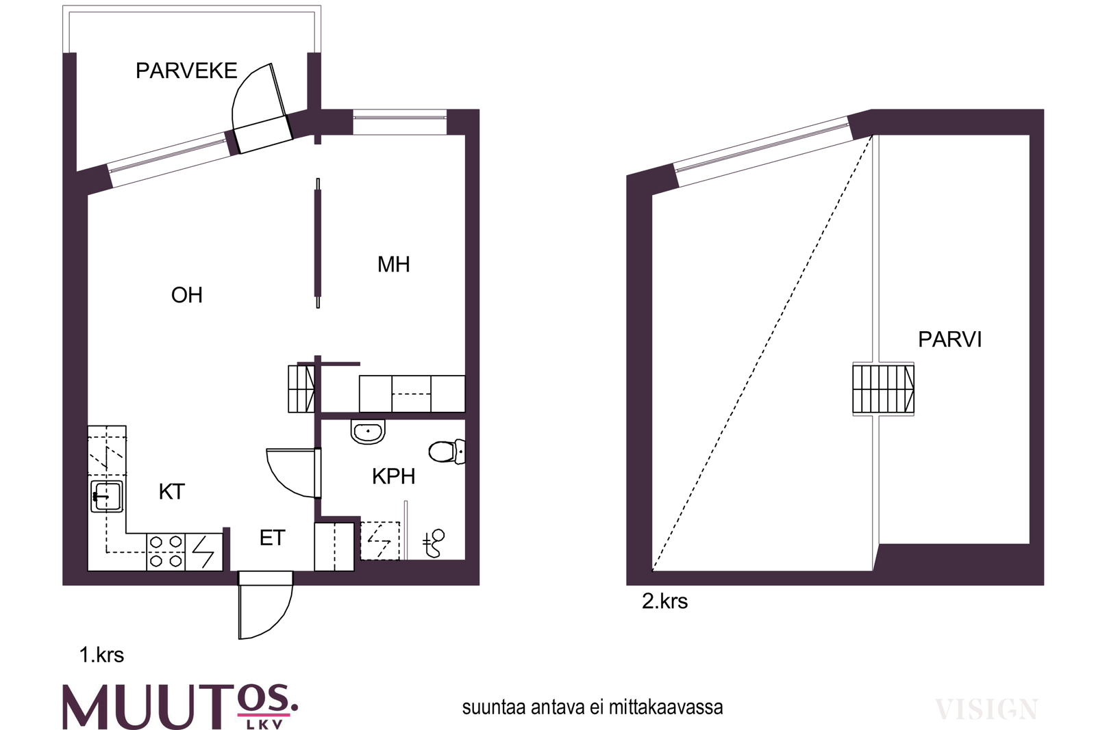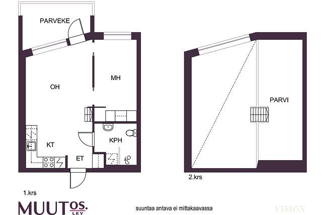 - Muihin tiloihin kuuluu parvi n. 14,72 m2 myyjältä saadun tiedon mukaan. Pinta-alaa ei ole tarkistusmitattu, mitattaessa pinta-ala saattaa olla ilmoitettua suurempi tai pienempi. Huoneiston todellinen pinta-ala voi olla yhtiöjärjestyksessä, isännöitsijäntodistuksessa ja esitteessä mainittua pienempi tai suurempi. Hinta ei ole pinta-alaperusteinen. Yhtiöjärjestyksen mukainen huoneistoselitelmä 2h + kt + parvi.