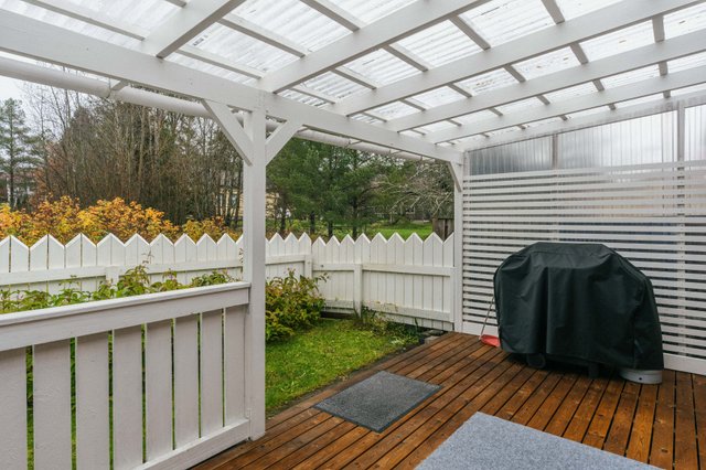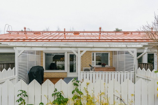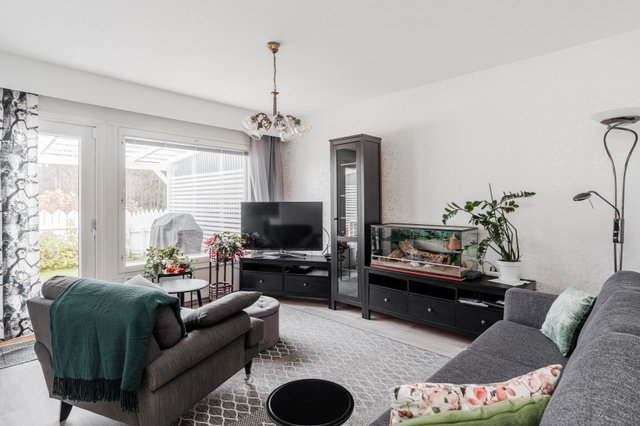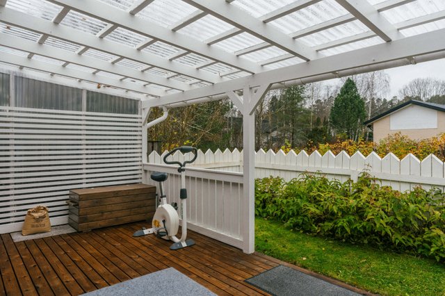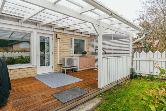 Olohuone avautuu osittain katetulle katseilta suojaisalle terassille ja aidatulle piha-alueelle, täydellinen paikka nauttia kesäpäivistä ja vilvoitella saunan jälkeen. Terassi soveltuu mainiosti myös pyykin kuivatukseen sateelta suojaavan katoksen vuoksi. Tänne voit halutessasi loihtia itsesi näköisen unelmien pikkupuutarhan kasveineen ja moninaisine istutuksineen.