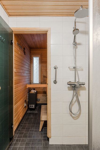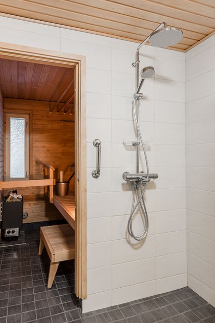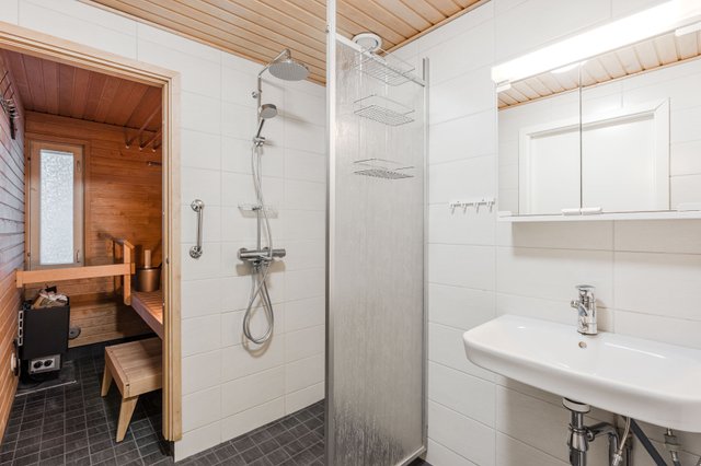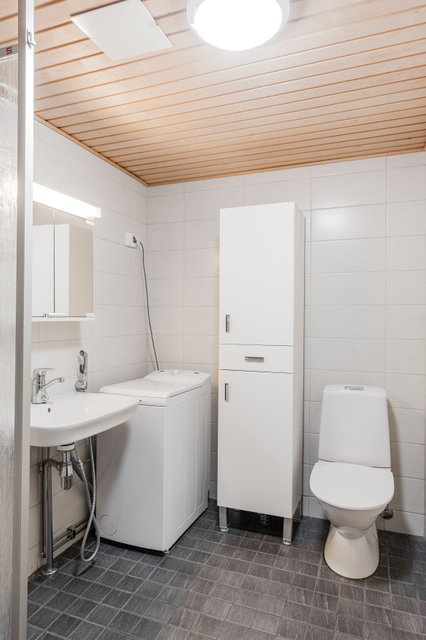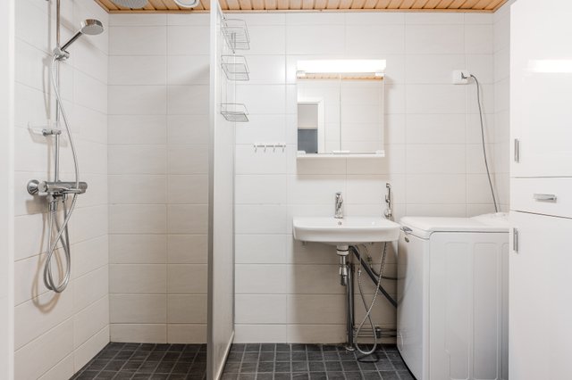 - WC-istuin, suihku, suihkuseinä, lattialämmitys, peilikaappi, pesuallas, bidee-suihku, hana, ja pesukoneliitäntä