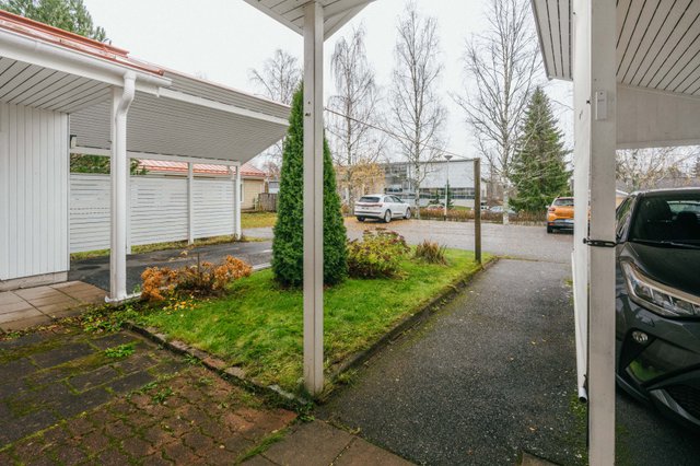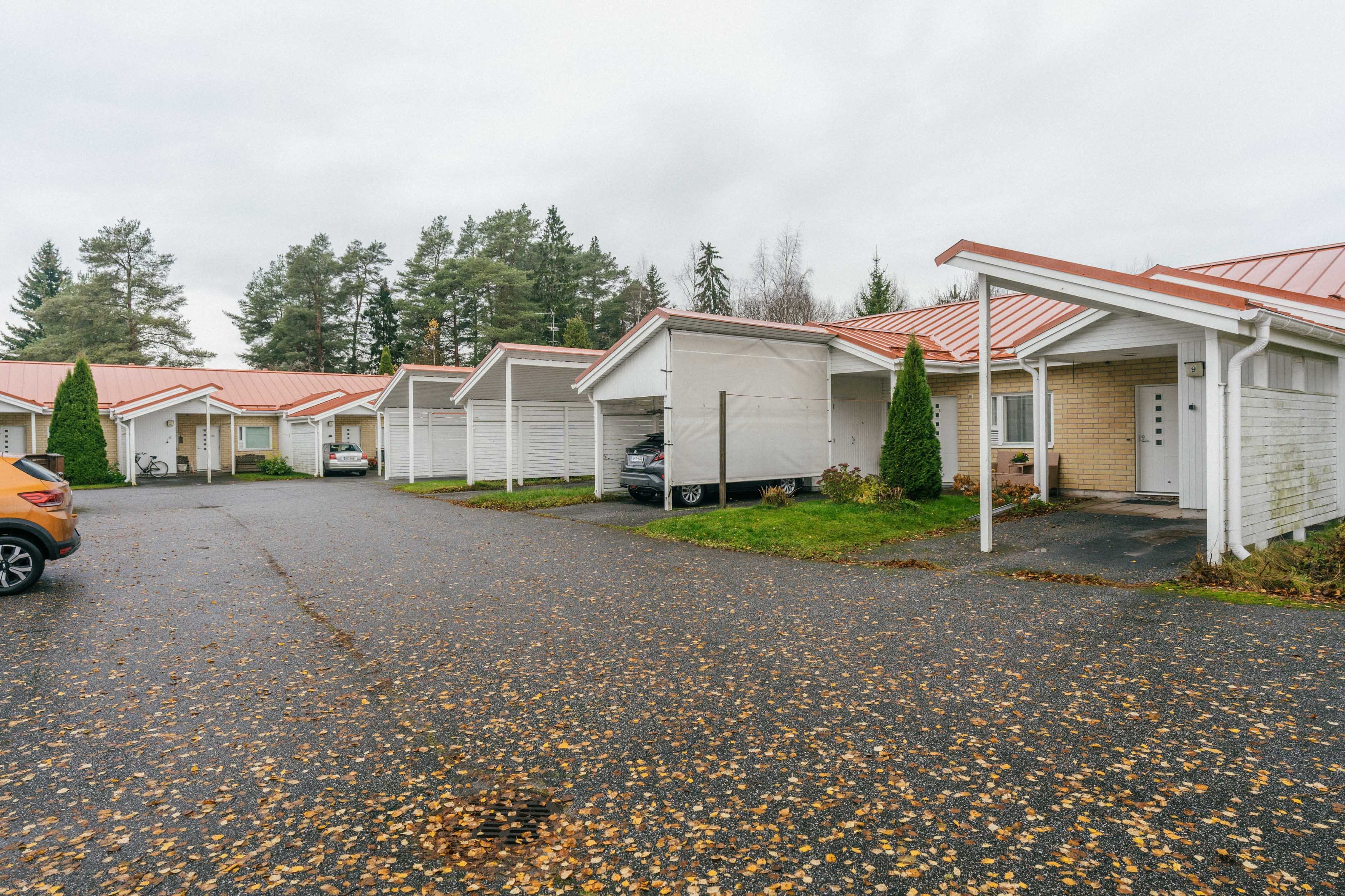 Jokaiselle asunnolle kuuluu oma autokatos- ja pihapaikka. Katoksen ja rakennuksen välissä on oma ulkovarasto.