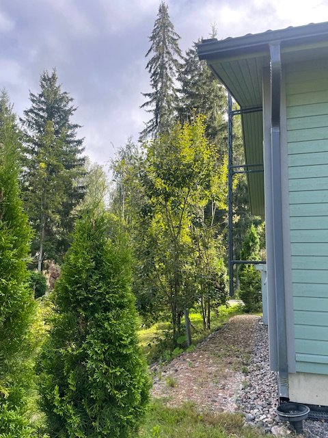 Piha on viimeistelty helppohoitoiseksi. Nurmipihalla on terassialue, tuijia, pensaita, kukkapenkkejä ja kivipolkuja.