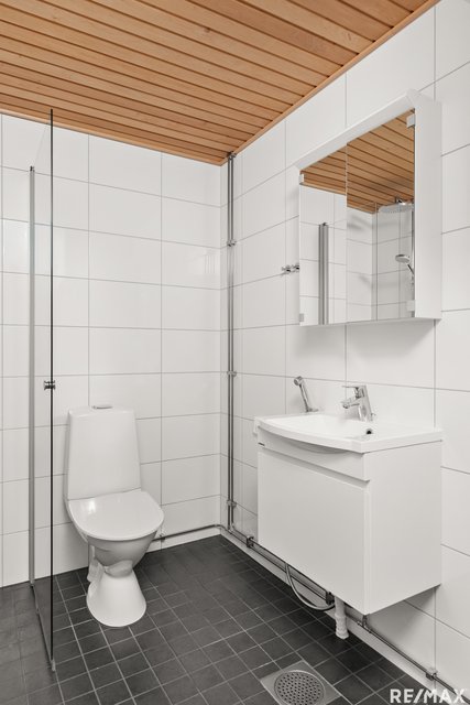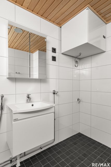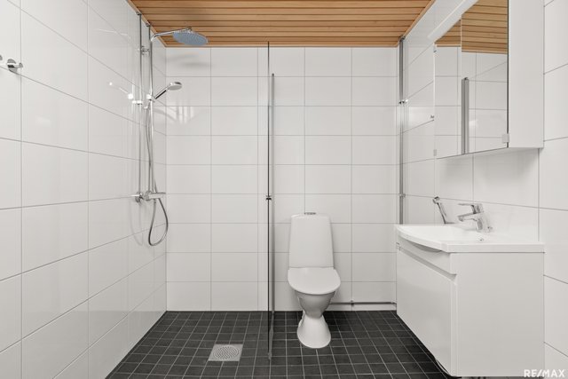 - WC-istuin, suihku, suihkuseinä, pesukoneliitäntä, lattialämmitys, peilikaappi, pesuallas, ja bidee-suihku