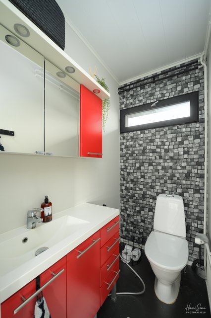 - Erillisessä wc:ssä allas- ja peilikaapisto. Pesuhuoneessa myös wc-istuin.