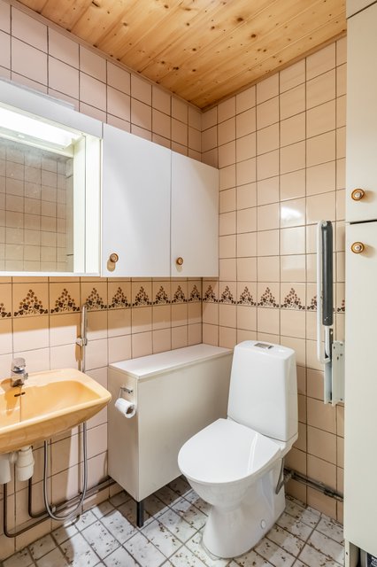 - 2kpl asuinrakennuksessa. Yläkerrassa laatta lattia ja laatoitetut seinät. Alakerrassa puulattiat ja seinät tapettia. 2kpl hallirakennuksessa.