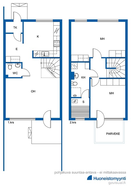 - Keittiö ja mh 1 itään, olohuone ja mh 2 länteen. Puistomaiset näkymät.