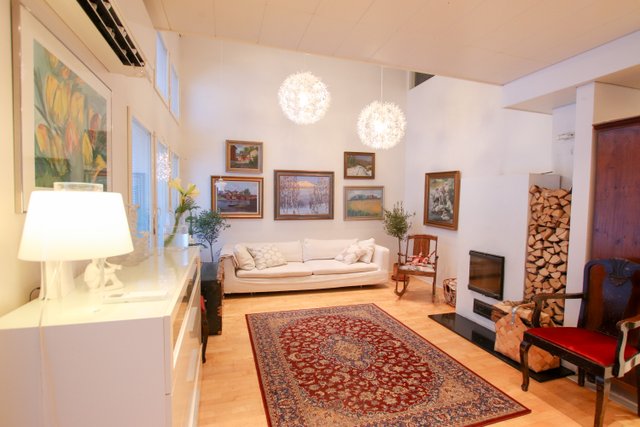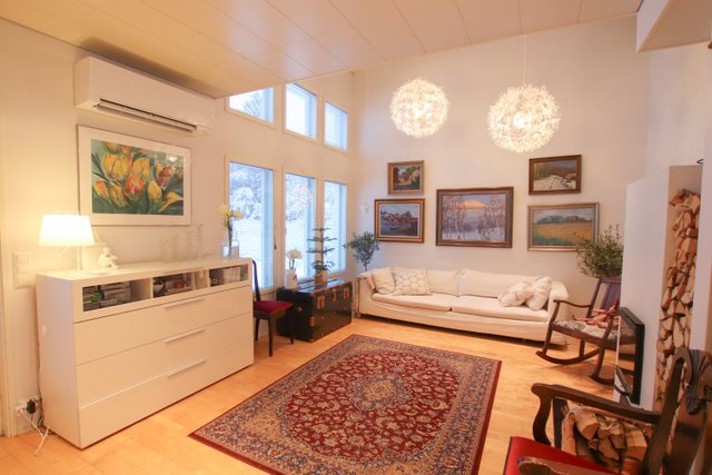 Olohuoneen korkeat katot ja varaava takka luovat viihtyisän ilmapiirin, ja keittiön kivitasot sekä nykyaikaiset kodinkoneet tekevät ruoanlaitosta nautinnon. Alakerran lattialämmitys tuo mukavuutta arkeen, ja ilmalämpöpumppu huolehtii talon energiataloudellisuudesta.