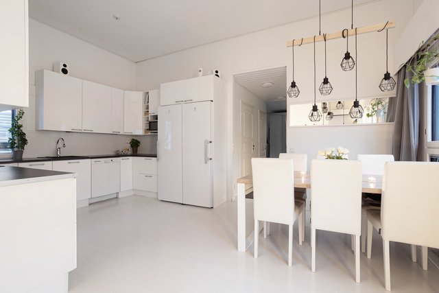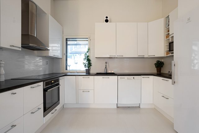 - Jääkaappi, erillinen pakastin, liesituuletin (Hormiin menevä), astianpesukone, liesi (Induktio), ja uuni