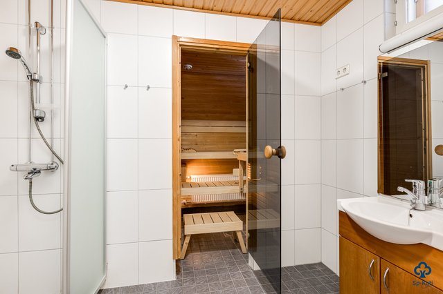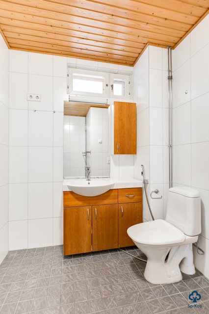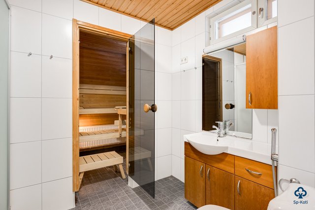 - WC-istuin, suihku, pesukoneliitäntä, lattialämmitys, peili, pesuallas, allaskaappi, ja bidee-suihku