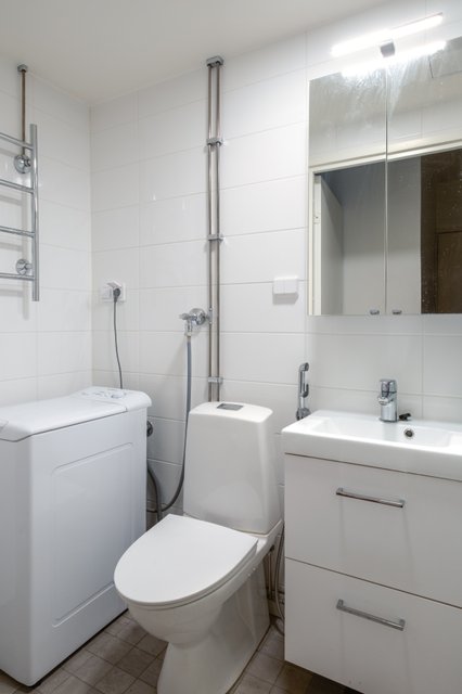 - Peilikaappi, pesuallas, allaskaappi, suihku, suihkuseinä (taitettavat), wc-istuin, bidee-suihku, pesukoneliitäntä, lattialämmitys, ja kuivauspatteri
