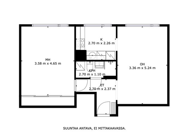 - Ei tarkistusmitattu. Pinta-alat saattavat tämän ikäisissä kohteissa (yhtiö rekisteröity ennen 01.01.1992) poiketa olennaisestikin asuinrakennusten nykyisten mittaustapojen ja standardien (SFS 5139) mukaan laskettavasta asuintilojen pinta-alasta. Pinta-ala voi siis olla edellä mainittua pienempi tai suurempi.