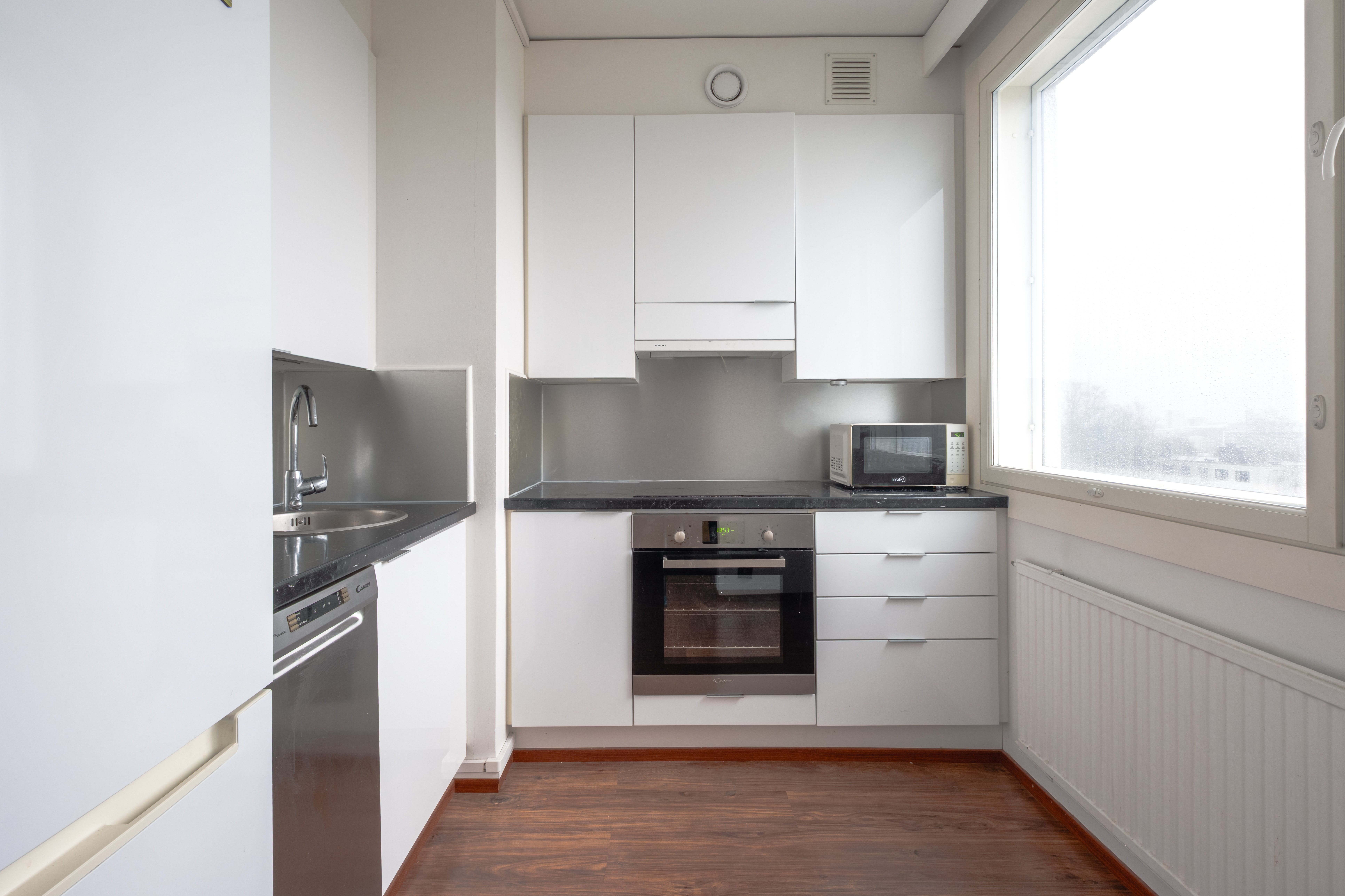 - Tilaan mahtuu ruokailuryhmä. Kertaalleen uusitut valkoiset kaapistot.