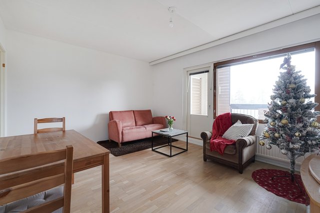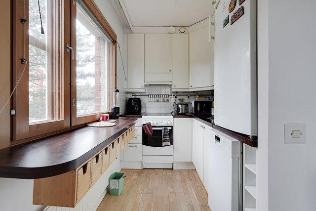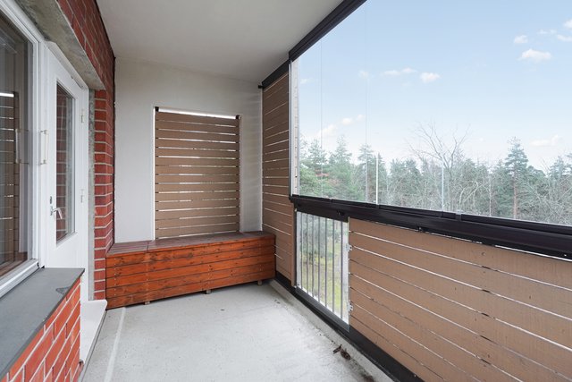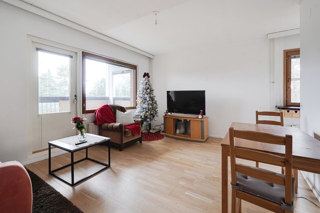 Keittiössä on kaikki tarvittava: jääkaappi, astianpesukone ja keraaminen liesi. Olohuoneen ja makuuhuoneen parkettilattiat luovat yhtenäisen ja lämpimän tunnelman. Lasitettu parveke toimii lisähuoneena keväästä syksyyn.