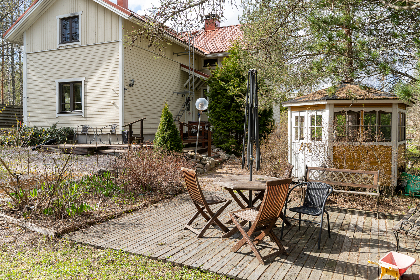 Laajalla 17 901 m² tontilla riittää mahdollisuuksia puutarhanhoidosta pienimuotoiseen viljelyyn – tontilta löytyy myös peltoa sekä viehättävä grillikatos ja huvimaja. Lisäksi talousrakennuksessa (n. 60 m²) on oma sauna, pesutilat, pukuhuone sekä varastotilaa ja puuliiteri.