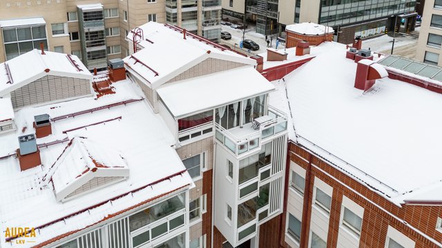 Tilat sijoittuvat hissillisen, omalla tontilla sijaitsevan 1990 valmistuneen taloyhtiön ylimpiin, neljänteen ja viidenteen kerrokseen. Ylimmän viidennen kerronksen huonetilojen erikoisuus on, ettei siinä ole seinänaapureita. Molemmissa kerroksissa on lasitettu parveke sisäpihan suuntaan, ja yläkerrassa lisäksi upea, etelään avautuva kattoterassi, jossa voi nauttia auringosta ja kaupungin tunnelmasta.