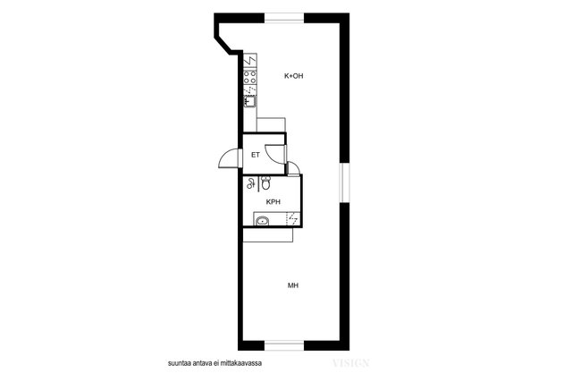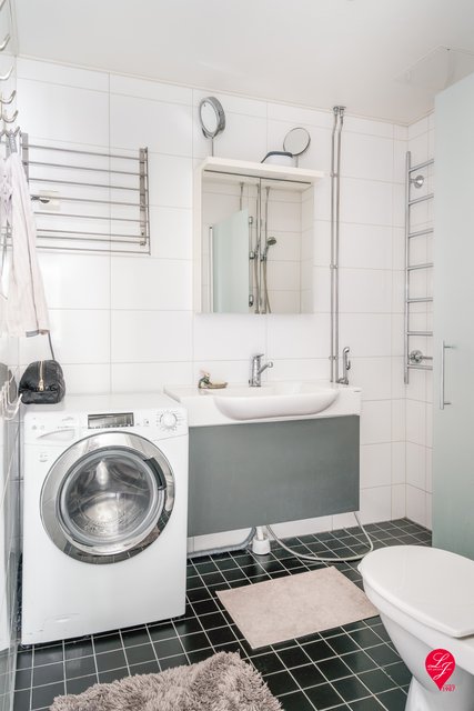 - Kokonaan laatoitettu kph lattialämmöllä; wc-istuin, suihku suihkuseinällä, lavuaarikaapisto, paikka pesukoneelle.