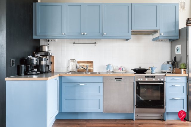 - Puiset siniharmaaksi maalatut keittiökaapit laminaattitasolla. Välitila laatoitettu. Siemensin kodinkoneet: jk/pk-torni, keraaminen liesi ja kiertoilmauuni, astianpesukone. Liesituuletin Ikea.