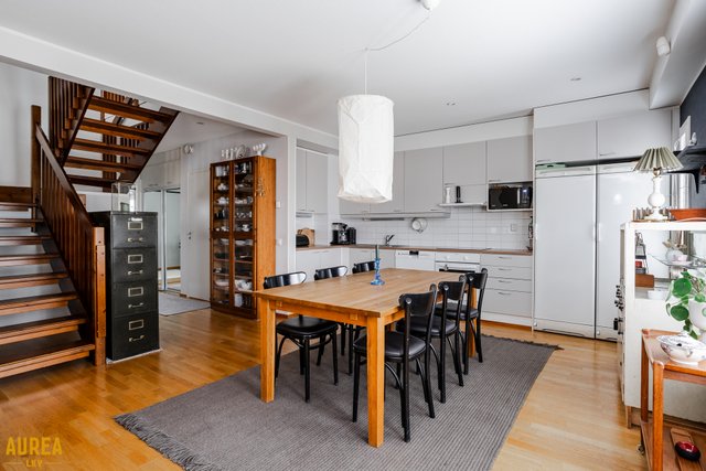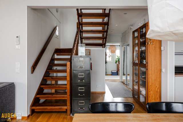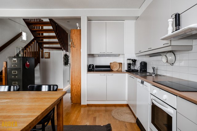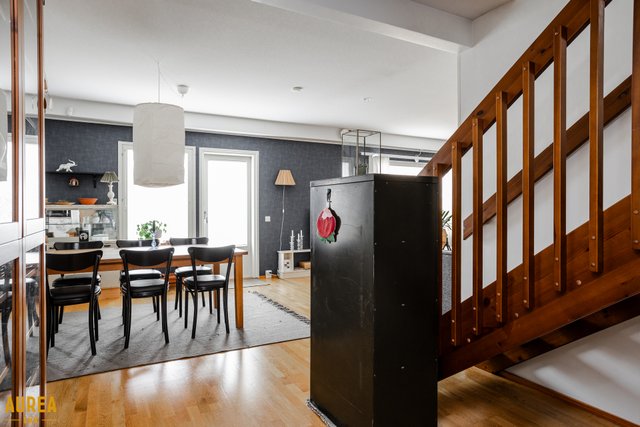 Kauniit tapetit ja harkitut maalisävyt tuovat sisustukseen persoonallisuutta ja lämpöä, tehden kodista tunnelmallisen ja kutsuvan. Tyylikäs ja ajaton Topi-keittiö kestää aikaa ja katseita. Alakerrassa avautuu avara, noin 40 m² kokoinen keittiön ja olohuoneen kokonaisuus, joka on kuin luotu yhdessäoloon ja viihtymiseen. Valoisasta olohuoneesta on käynti etelään suuntautuvalle terassille ja aidatulle pihalle, jossa voit nauttia auringosta koko päivän.