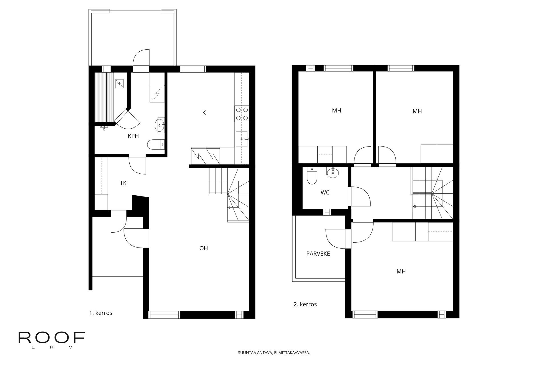 Yläkerrassa sijaitsevat kolme makuuhuonetta sekä erillinen wc tuovat käytännöllisyyttä perheen arkeen. Alakerrassa on tilava olohuone sekä erillinen keittiö. Kylpyhuoneen ja saunan kokonaisuus on selkeä ja toimiva, ja pesutiloista pääsee suoraan takapihalle vilvoittelemaan löylyjen jälkeen.