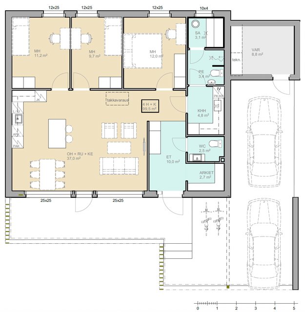 - Eteisen (10m2) yhteydessä myös arkieteinen (2,7m2). Tilava (8,8m2) lämmin varasto autokatoksen päädyssä.