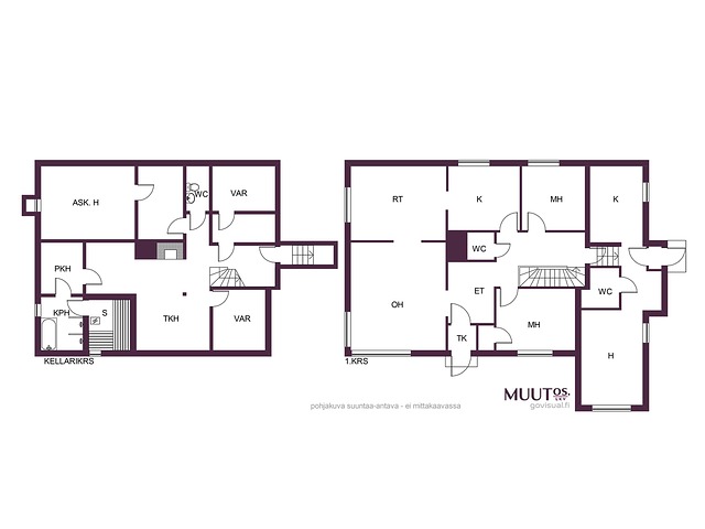 - Takkahuone, ruokailuhuone. Alakerrassa paljon tiloja joita mahdollista käyttää moneen käyttötarkoitukseen. Yläkerran vanhan osan lattiat parkettia, laajennusosassa lankku -sekä laminaattilattiaa. Alakerta lankkulattia.