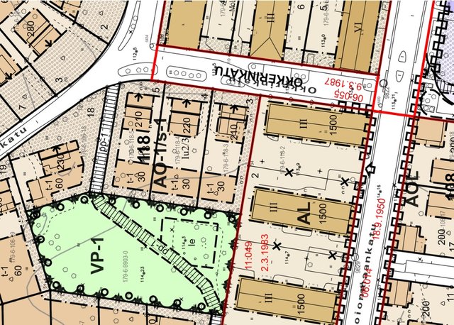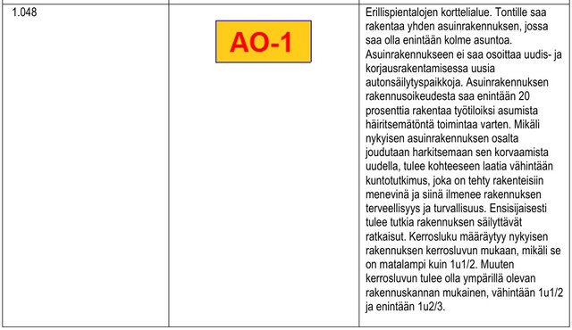 - AO-1 Erillispientalojen korttelialue. Tontille saa rakentaa yhden asuinrakennuksen, jossa saa olla enintään kolme asuntoa. Asuinrakennukseen ei saa osoittaa uudis- ja korjausrakentamisessa uusia autonsäilytyspaikkoja. Asuinrakennuksen rakennusoikeudesta saa enintään 20 prosenttia rakentaa työtiloiksi asumista häiritsemätöntä toimintaa varten. Mikäli nykyisen asuinrakennuksen osalta joudutaan harkitsemaan sen korvaamista uudella, tulee kohteeseen laatia vähintään kuntotutkimus, joka on tehty rakenteisiin menevinä ja siinä ilmenee rakennuksen terveellisyys ja turvallisuus. Ensisijaisesti tulee tutkia rakennuksen säilyttävät ratkaisut. Kerrosluku määräytyy nykyisen rakennuksen kerrosluvun mukaan, mikäli se on matalampi kuin 1u1/2. Muuten kerrosluvun tulee olla ympärillä olevan rakennuskannan mukainen, vähintään 1u1/2 ja enintään 1u2