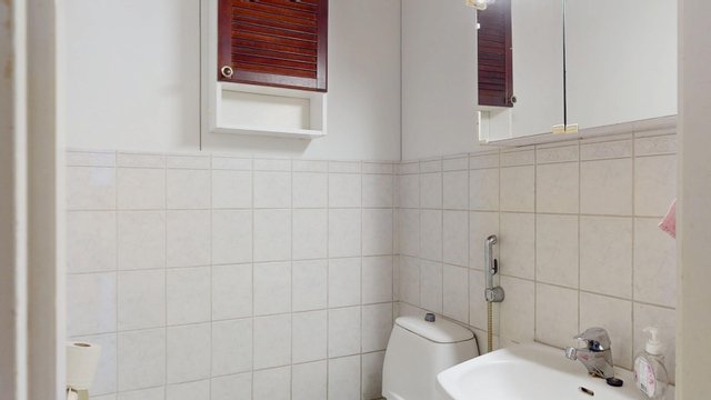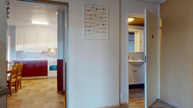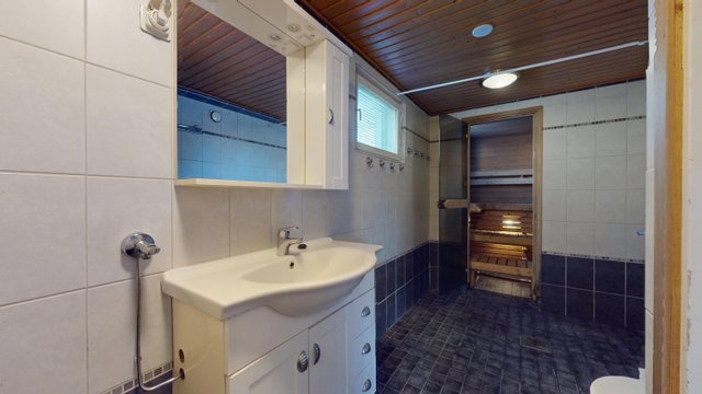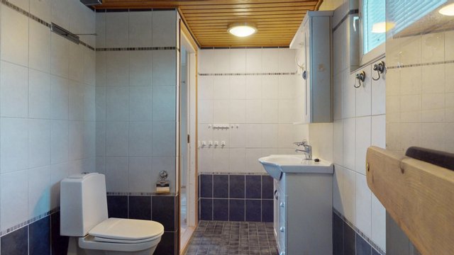 - WC-istuin, suihku, pesukoneliitäntä, lattialämmitys, peili, pesuallas, ja allaskaappi