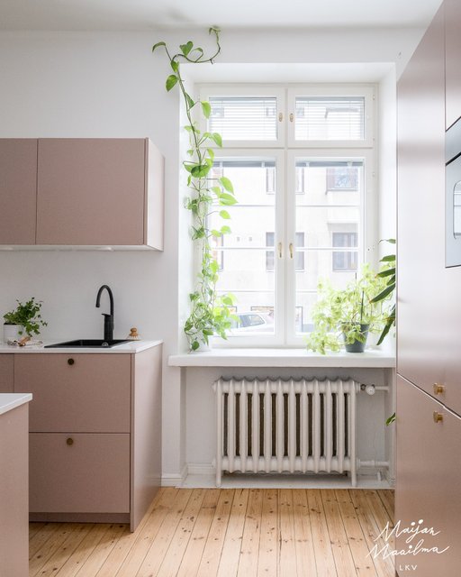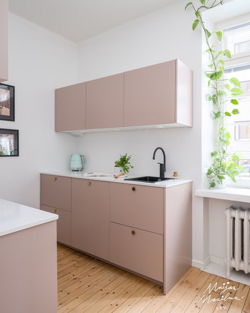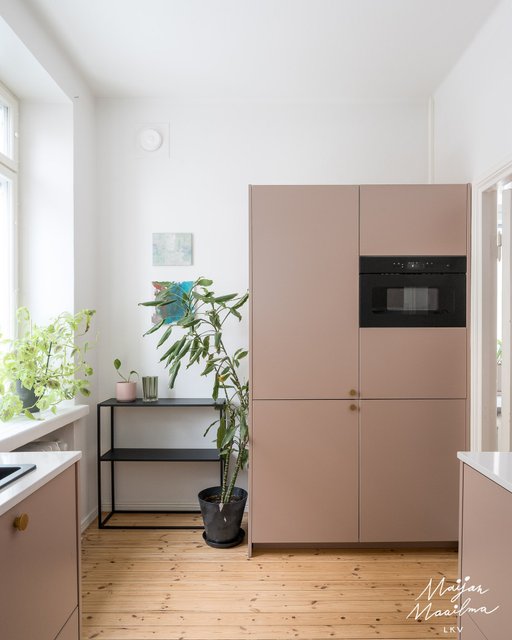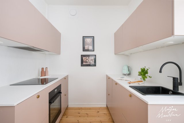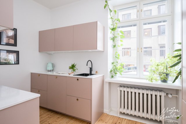 - Lautalattia, maalatut seinät. Kvartsitasot. Roosapuuterinsävyiset kaapistojen ovet (A.S.Helsingö), Ikean rungot. Liesi, uuni, mikroaaltouuni, jääkaappi-pakastin, astianpesukone ja liesituuletin.