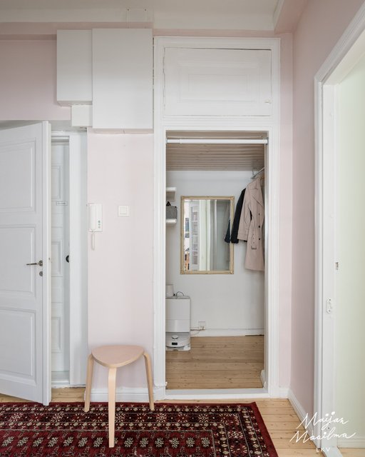 - Eteinen: Lautalattiat, maalatut seinät. Vaatenaulakko. Eteisen yhteydessä walk in -vaatehuone. Walk in -vaatehuone: Lautalattia, maalatut seinät. Hyllytilaa ja tilaa ripustettaville vaatteille.