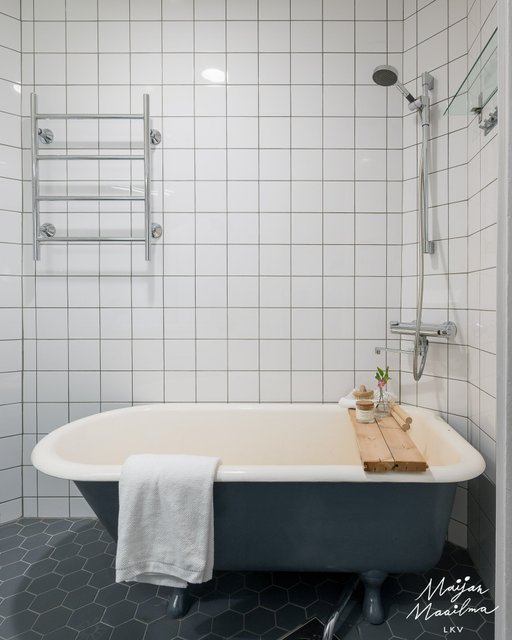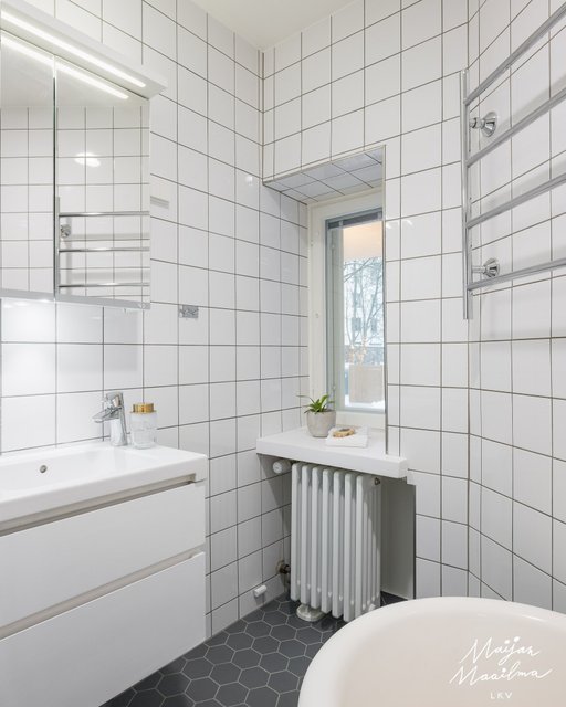 - Lattia laattaa ja seinät laattaa. Pesukoneliitäntä, suihku, kylpyamme. Allaskaappi, allas, allashana ja peilikaappi. Lattialämmitys ja pyyhepatteri. Ikkuna.