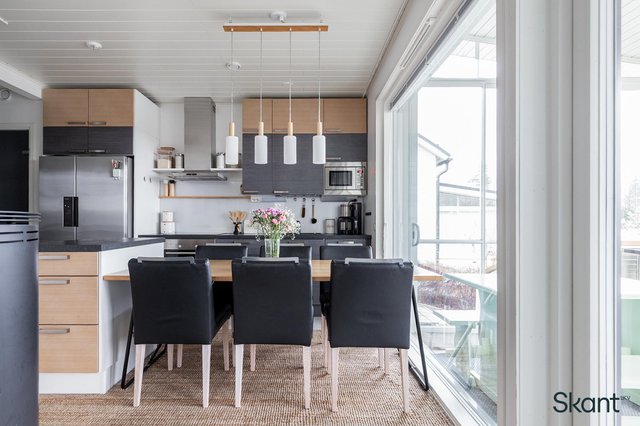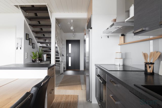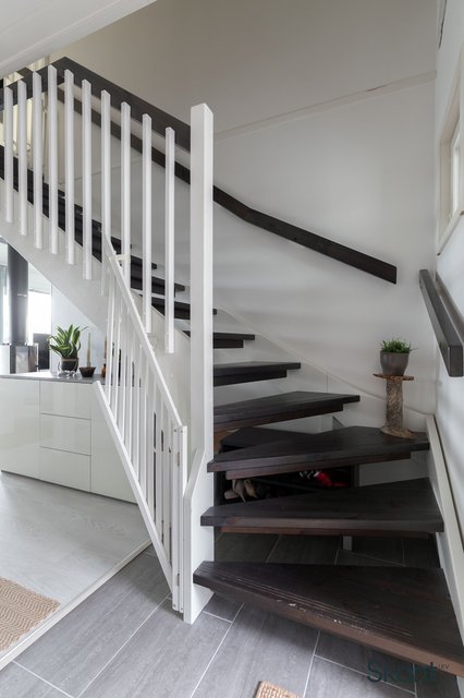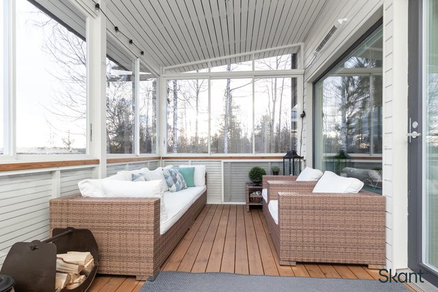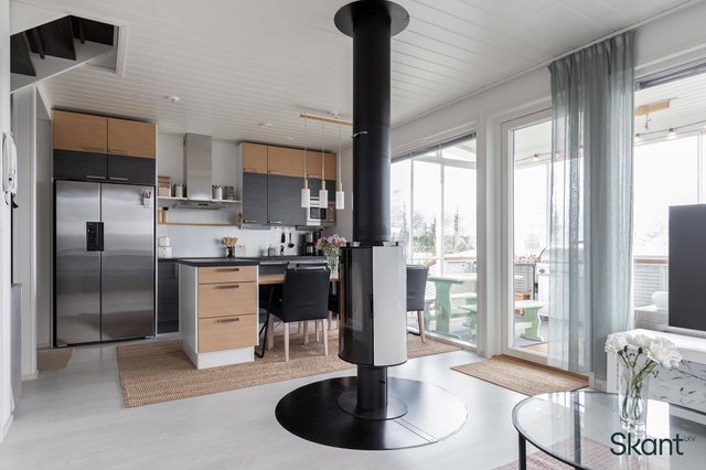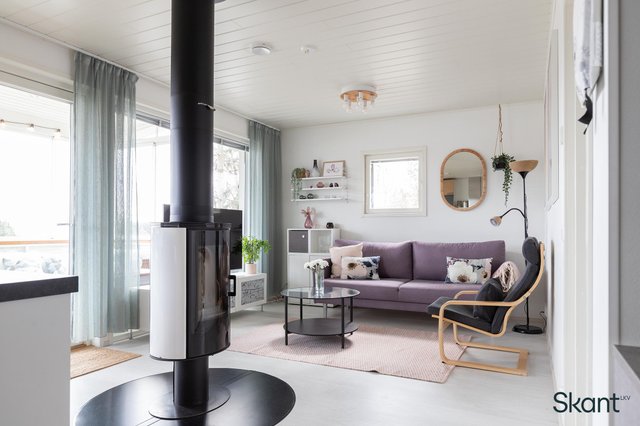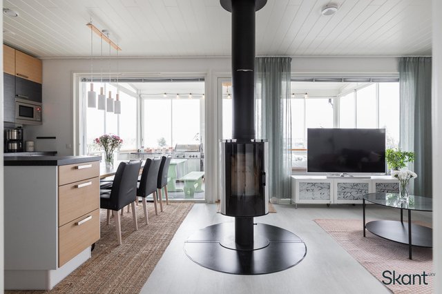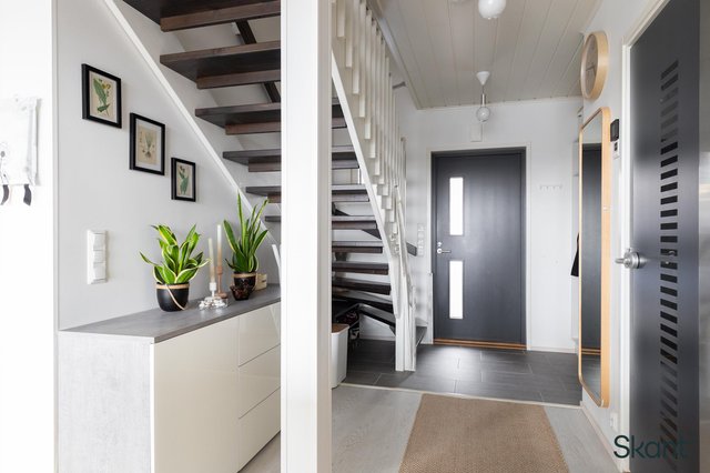 Pääovesta sisään astuessa vastassa on tilava, laatoitettu eteinen. Eteisestä avautuva olohuone-keittiö muodostaa avaran yhtenäisen tilan, johon isot ikkunat ja tunnelmallinen takka luovat mukavasti kodikkuutta. Olohuoneesta on käynti aamuaurinkoon suuntautuvalle, suojaisalle lasitetulle terassille. Alakerrassa sijaitsevat myös saunatilat, toinen wc sekä yksi kodin makuuhuoneista. Yläkerrasta löytyy kaksi hyvänkokoista makuuhuonetta sekä erillinen wc, jossa on varaus suihkulle.