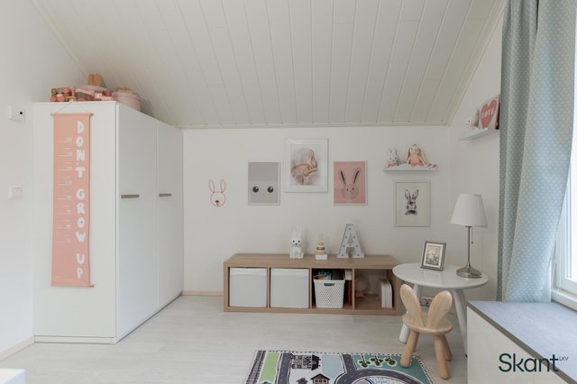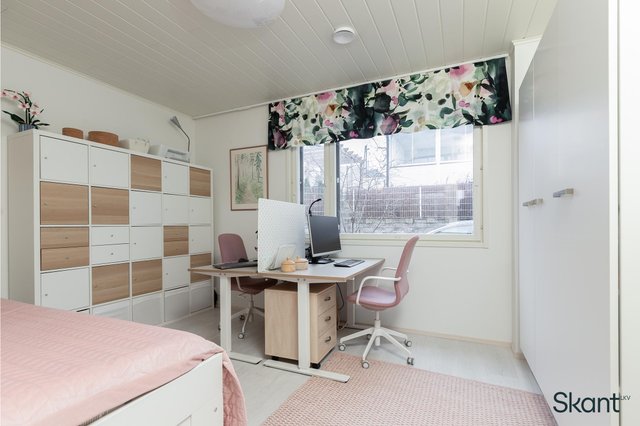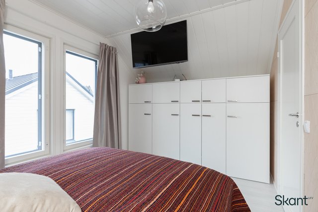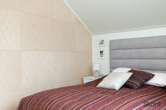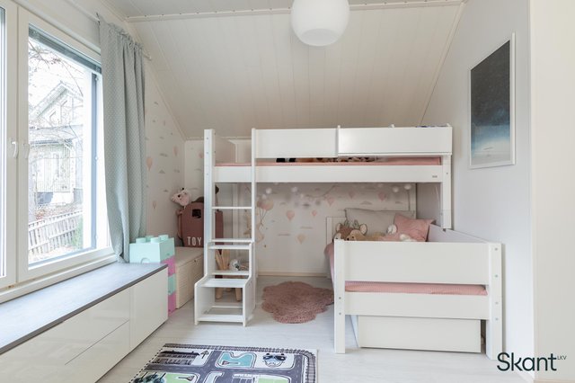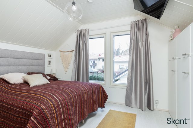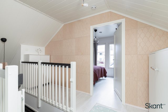 - Yläkerran makuuhuoneessa Koivui sisustuspaneeliseinä. Makuuhuoneissa kiinteät kaapistot.