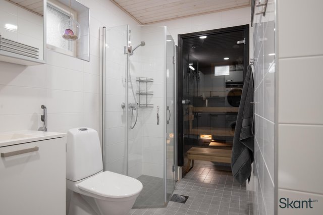 - WC-istuin, suihkuseinä, lattialämmitys, pesuallas, allaskaappi, peilikaappi, pesukoneliitäntä, paikka kuivausrummulle, ja bidee-suihku