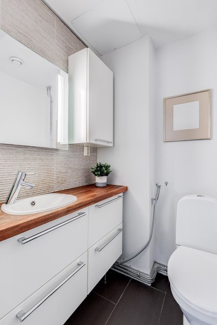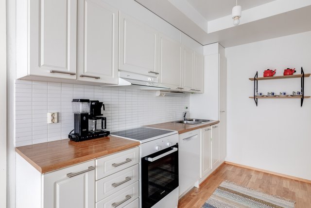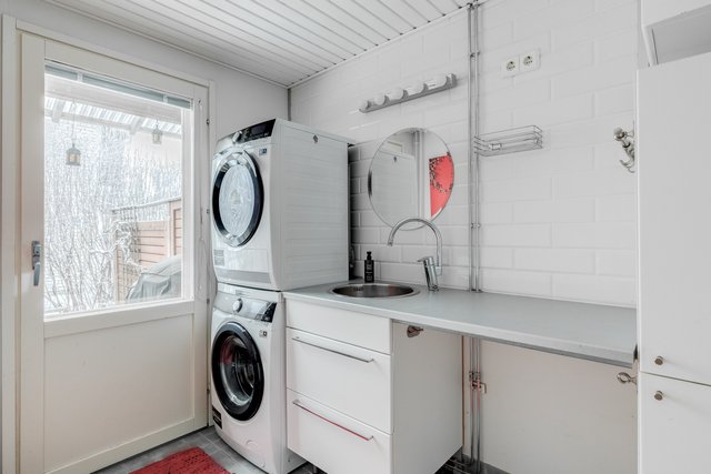- Pesukoneliitäntä, pesuallas, pöytätaso, pyykkikaapit, tila pesutornille, ja lattialämmitys