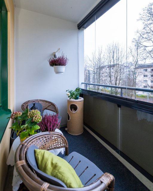 Huoneiston keskellä on eteinen, vaatehuone ja kylpyhuone. Läpitalon huoneiston toisessa päädyssä on olohuone, josta pääsee lasitetulle parvekkeelle viettämään aikaa ja seuraamaan pihan tapahtumia.