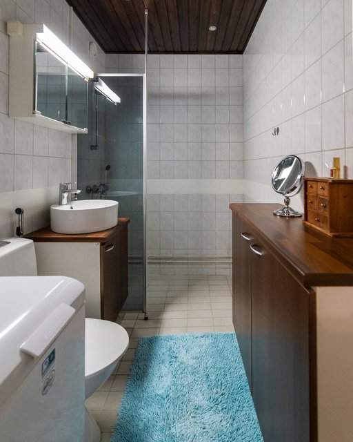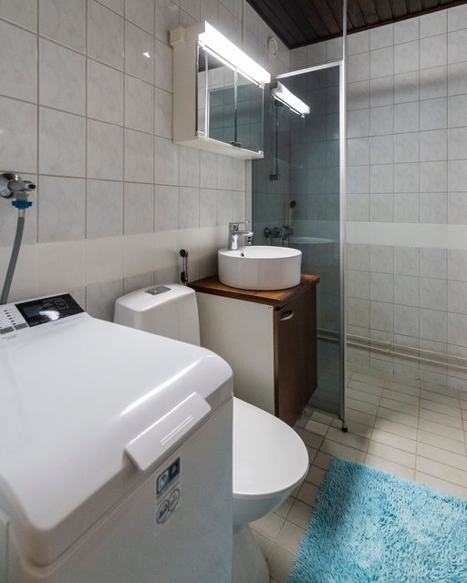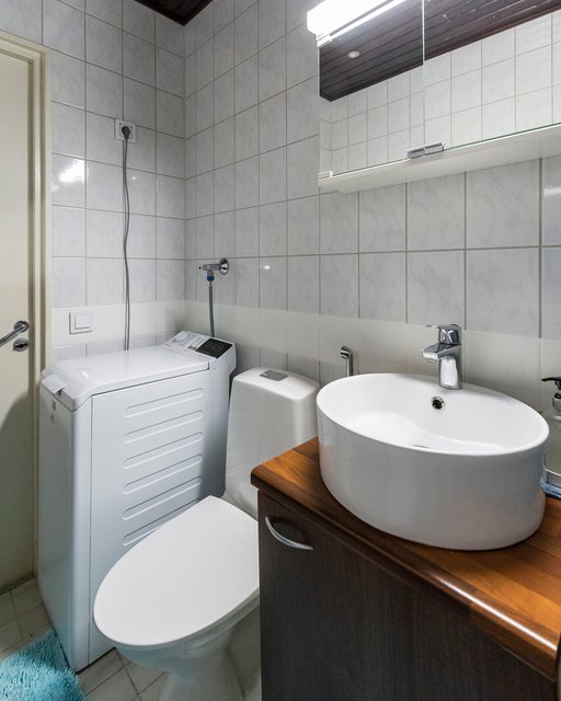 - WC-istuin, suihku, suihkuseinä, pesukoneliitäntä, peilikaappi, pesuallas, allaskaappi, ja bidee-suihku