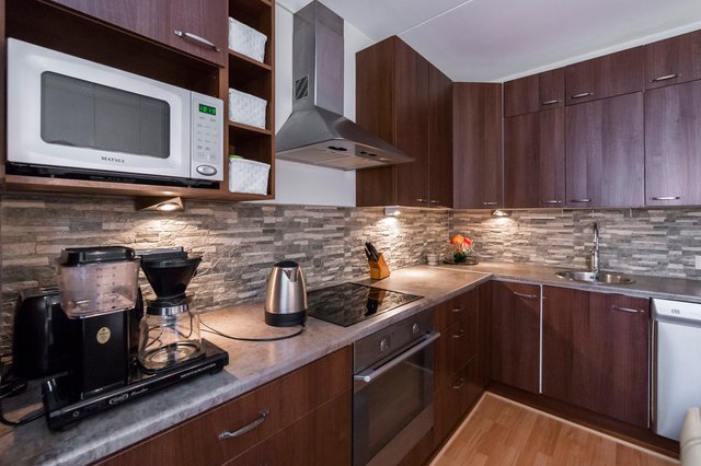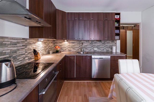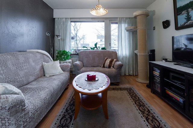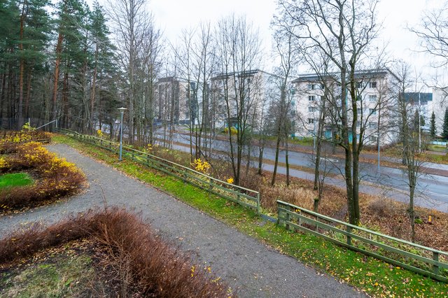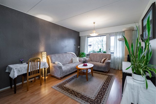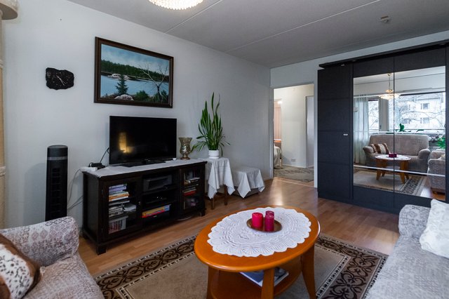 Tämä siisti kaksio sijaitsee ensimmäisessä kerroksessa, mutta ei kuitenkaan ihan maan tasalla. Tilavasta eteisestä on kulku asunnon muihin tiloihin, eli pohjaratkaisu on varsin selkeä. Huoneiston toisessa päässä on makuuhuone ja hyvin varusteltu keittiö. Työskentelytilaa on reilusti, joten kokkaaminen on mukavaa. Ruokaryhmällekin on hyvin tilaa ikkunan ääressä.