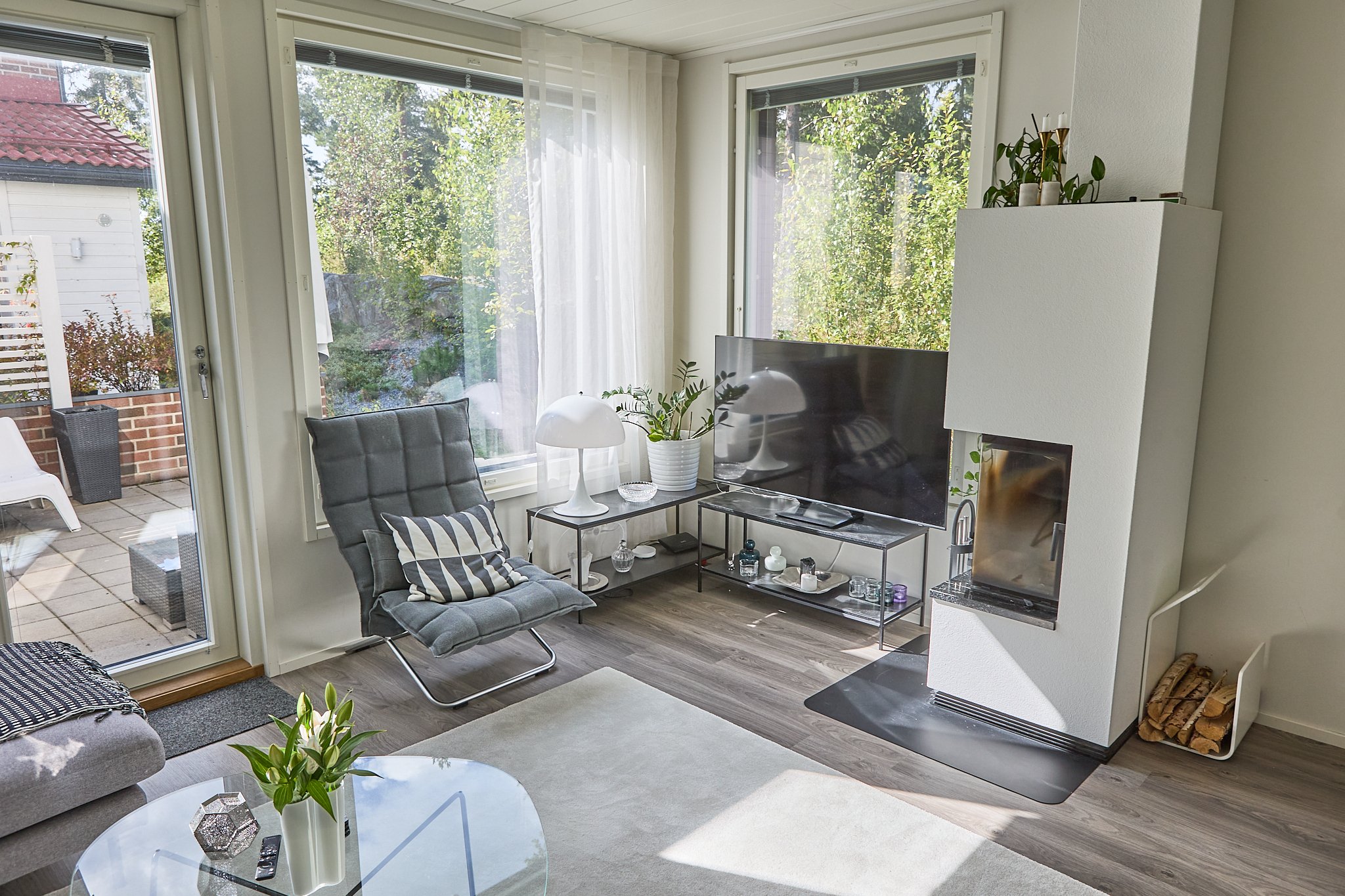 - Olohuoneesta kulku takapihalle. Olohuoneessa lisävarusteena asennettu Schmid kevyt takka.