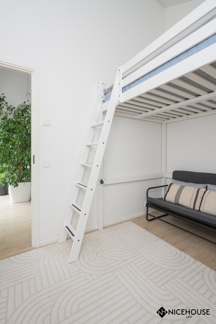 - Kolme makuuhuonetta ja rakennusluvalla voi rakentaa lisää asumista tukevia tiloja käyttöullakolle.